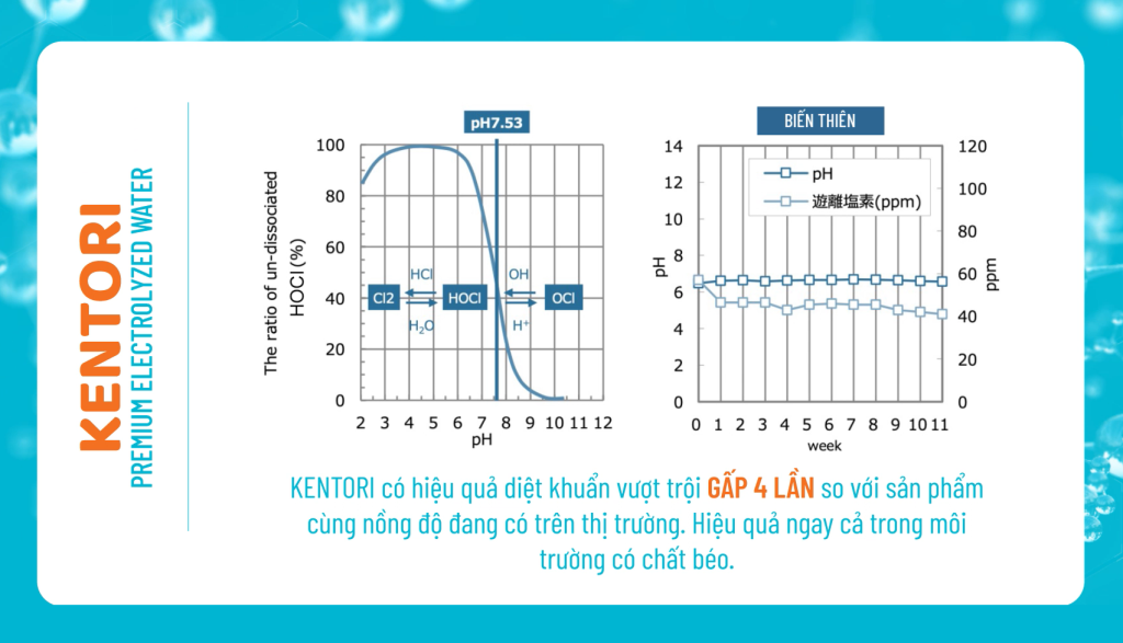 Hypochlorous acid (HOCL) mà Kentori sử dụng được xem như một vũ khí tối tân, khả năng tiêu diệt các vi khuẩn chỉ trong nháy mắt – cụ thể chỉ 5 giây sau khi tiếp xúc. Đây không chỉ là một bước tiến lớn trong ngành công nghệ kháng khuẩn, mà còn là lợi ích tuyệt vời cho người tiêu dùng muốn bảo vệ sức khỏe cho bản thân và người thân yêu.