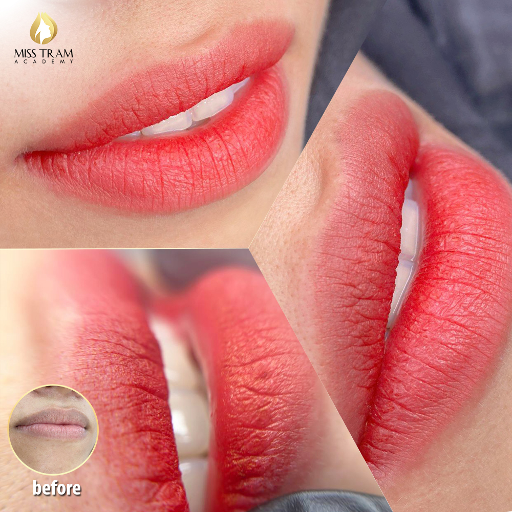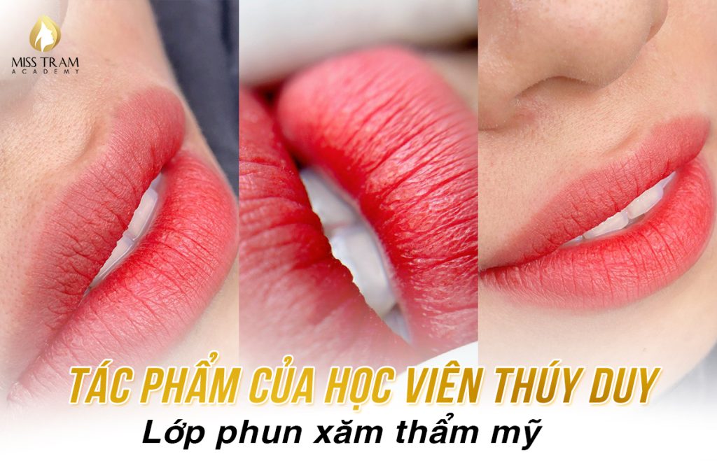 Một tác phẩm nổi bật gần đây từ lớp phun xăm thẩm mỹ tại Miss Tram Academy là đôi môi đỏ đào của học viên Thúy Duy. Tác phẩm này không chỉ căng mực mà còn không bám cặn, thể hiện sự hài hòa giữa yếu tố thẩm mỹ và kỹ thuật. Đây là minh chứng rõ nét cho chất lượng đào tạo tại Miss Tram Academy, nơi mà mỗi sản phẩm đều mang dấu ấn của sự chuyên nghiệp và đam mê.