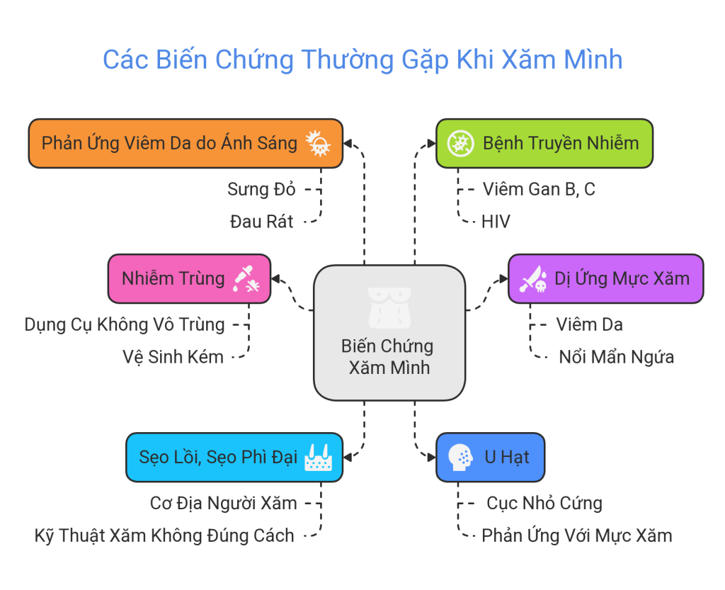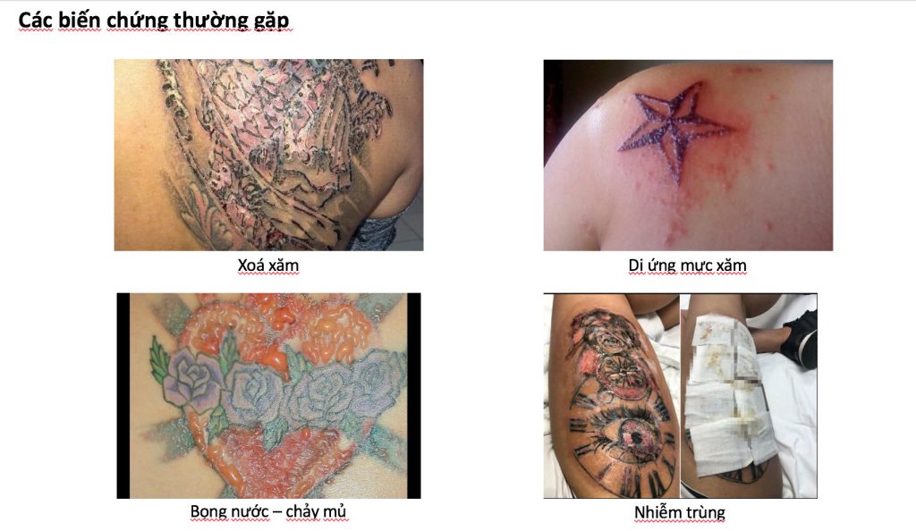Sau khi xăm, một số biến chứng có thể xảy ra mà bạn cần lưu ý như: nhiễm trùng do vệ sinh/dụng cụ kém, dị ứng mực xăm, sẹo lồi, u hạt, phồng rộp khi tiếp xúc ánh sáng, nhiễm bệnh truyền nhiễm, biến dạng hình xăm do thay đổi cân nặng, phản ứng trên máy MRI…